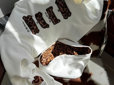 款式特点<br/><br/>• 版型:多为宽松的oversize版型,穿着舒适,不挑身材,能展现随性慵懒的美式街头风格。<br/><br/>• 帽型:采用双层大帽檐设计,部分帽子耳朵是立体的,且有充棉,造型挺括,既保暖又能修饰脸型,显脸小。<br/><br/>• 图案:以豹纹元素为核心,常结合字母、星星、爱心等印花,通过刺绣、贴布或数码印花工艺呈现,增加潮流感。<br/><br/>• 门襟:有套头和拉链开衫两种款式,满足不同穿着需求。<br/><br/>面料材质<br/><br/>• 纯棉材质:部分卫衣采用100%纯棉面料,如嘉昕毛衣针织厂的秋季新款美式复古刺绣恶魔豹纹贴布连帽拉链情侣卫衣,柔软亲肤,透气性好。<br/><br/>• 棉涤混纺:例如GMS的情侣美式豹纹贴布刺绣LOGO卫衣,棉含量68%,聚酯纤维含量32%,结合了棉的舒适和涤纶的耐用性,不易变形。<br/><br/>• 涤纶材质:像欧美街头豹纹潮流风数码印花双层帽印花男女连帽卫衣,主面料成分是涤纶,含量在90%-95%之间,具有易打理、不易皱的特点。<br/><br/>尺码颜色<br/><br/>• 尺码:一般提供S-3XL等多种尺码选择,部分款式支持定制,满足不同身材的情侣需求。<br/><br/>• 颜色:常见有黑色、白色、灰色等基础色,也有红色等个性颜色,部分卫衣内里帽衬为豹纹图案,增加层次感。<br/><br/>价格区间<br/><br/>• 价格因品牌、材质和工艺不同有所差异,批发价在38元-88元之间,零售价通常在79元-269元之间。<br/><br/>代表商品<br/>• MEDM的豹纹帽里皮牌休闲拉链帽衫美式通勤情侣休闲开衫连帽卫衣,折后价260元,袖口和帽子上的小豹纹设计有层次,面料柔软。